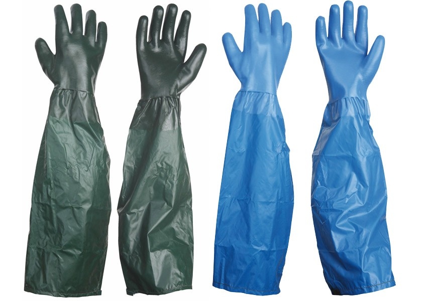 velikost 10,5", úplet máčený v PVC s nitrilem, zdrněná dlaň, PVC návlek na paži, 60 cm | ||