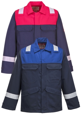 Nehořlavá pracovní bunda PORTWEST FR55 BIZFLAME Plus reflex dvoubarevná 350 - oblíbená dvoubarevná antistatická svářečská blůza s reflexní páskou pro lepší viditelnost, trojité prošití, vysoká viditelnost, náprsní kapsy s patkou na druk, krytý mosazný zip, nastavitelný rukáv, ochrana proti sálavému, konvekčnímu a kontaktnímu teplu, třída 2 svařovací ochrany, trojitě šité švy pro větší odolnost, certifikovaná ochrana proti postřiku roztaveným kovem, CE certifikace, CE-Kat. III., blůza splňuje požadavky norem EN ISO 11612 A1+A2, B1, C1, E2, F1, EN ISO 11611 Třída 2 A1+A2, EN 1149 -5, materiál: tkanina Bizflame Work, 99% Bavlna, 1% uhlíková vlákna, 350 g/m2, barva navy (tmavě modrá s červeným sedlem nebo barva navy (tmavě modrá) se středně modrým (royal) sedlem, velikosti S,M,L,XL,XXL,3XL.