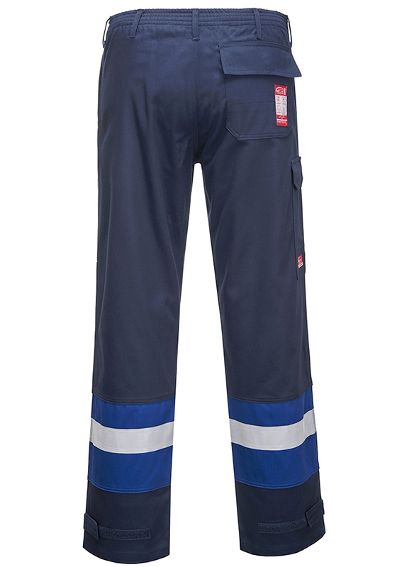 Nehořlavé kalhoty do pasu PORTWEST FR56 BIZFLAME Plus reflex dvoubarevné 350 - oblíbené dvoubarevné antistatické svářečské kalhoty s reflexní páskou pro lepší viditelnost, trojité prošití, vysoká viditelnost, ochrana proti sálavému, konvekčnímu a kontaktnímu teplu, třída 2 svařovací ochrany, trojitě šité švy pro větší odolnost, zadní kapsa, kapsa na metr, nastavitelný spodní lem na suchý zip, napůl elastický pas pro bezpečné a pohodlné nošení, dvoustupňové kolenní kapsy umožňují dvě možnosti umístění nákoleníků, 6 kapes pro uložení věcí, certifikovaná ochrana proti postřiku roztaveným kovem, CE certifikace, CE-Kat. III., oděv splňuje požadavky norem EN ISO 11612 A1+A2, B1, C1, E2, F1, EN ISO 11611 Třída 2 A1+A2, EN 1149 -5, materiál: tkanina Bizflame Work, 99% Bavlna, 1% uhlíková vlákna, 350 g/m2, barva navy (tmavě modrá s červeným pruhem na nohavici nebo barva navy (tmavě modrá) se středně modrým (royal) pruhem na nohavici, velikosti S,M,L,XL,XXL,3XL.