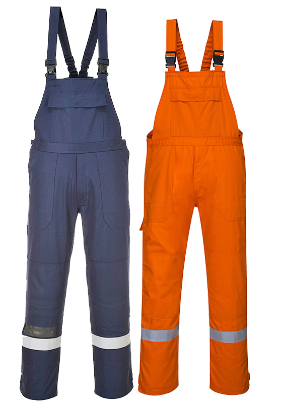 Nehořlavé kalhoty s laclem PORTWEST FR27 BIZFLAME Plus reflex 350 - svářečské antistatické kalhoty s náprsenkou a reflexní páskou pro lepší viditelnost, trojité prošití, vysoká viditelnost, dvě přední našité kapsy, kapsa na metr, náprsní kapsa, zadní kapsa s patkou na cvoček, nastavitelné spodní nohavice, ochrana proti sálavému, konvekčnímu a kontaktnímu teplu, třída 2 svařovací ochrany, trojitě šité švy pro větší odolnost, certifikovaná ochrana proti postřiku roztaveným kovem, CE certifikace, CE-Kat. III., kalhoty splňují požadavky norem EN ISO 11612 A1+A2, B1, C1, E2, F1, EN ISO 11611 Třída 2 A1+A2, EN 1149 -5, materiál: tkanina Bizflame Plus, 99% Bavlna, 1% uhlíková vlákna, 350 g/m2, velikosti S,M,L,XL,XXL,3XL.