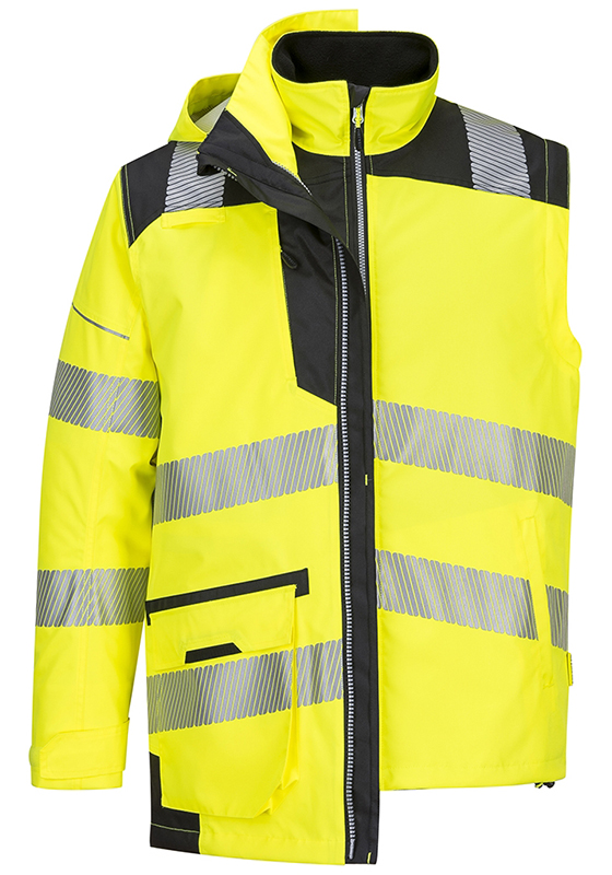 Reflexní bunda PORTWEST PW367 Hi-Vis 5v1 mutifunkční zateplená - žlutá/černá - z této výstražné multifunkční bundy lze využít až 5 různých pracovních oděvů pro různé pracovní podmínky a využijete ji tak při coloročním používání, jde o chytře navržený prodyšný oděv, vnější bunda má řešení s několika kapsami s vyhrazeným prostorem pro telefon, klíče nebo rukavice, zatímco vnitřní nepromokavá bunda má polstrovanou podšívku pro maximální teplo a pohodlí, bunda je nepromokavá, ale prodyšná s lepenými švy, které zabraňujípronikání vody, voda na povrchu vytvoří kapičky, které samovolně stečou, svrchní materiál je prodyšný 300D 100% Polyester, 300D Oxford Weave, s dvojitým PU zátěrem, prodyšný, s povrchovou úpravou proti ušpinění, 190g/m2, bunda má síťovinovou podšívku ze 100% Polyesteru, 60 g/m2, vnitřní bunda je z materiálu 100% polyester fleece, 400g/m2, výplň a zateplení je ze 100% polyesteru, 100 g/m2, bunda má dvoucestný zip, nastavitelné manžety na suchý zip, odepínací kapuce je skrytá v límci, reflexní pásky jsou nažehlovací a umožňují tak výrazně vyšší komfort a pohyb, výstražný oděv byl certifikován dle EN ISO 20471 třída 3 po 50 pracích cyklech, dále je bunda certifikována jako nepromokavá dle EN 343 třída 4:3 X WP 10,000MM, MVP 10,000 G/M2/24HRS, velikosti S,M,L,XL,XXL,3XL,4XL,5XL.