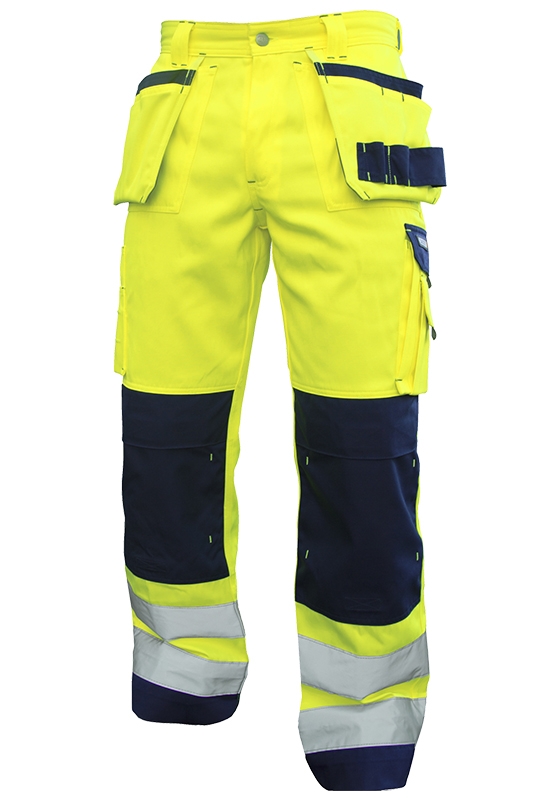 Reflexní kalhoty do pasu DASSY GLASGOW Hi-Vis - 290 - tyto kalhoty jsou v normální vnitřní délce nohavice = 81 cm, díky vnitřní záložce můžete tyto kalhoty jednoduše prodloužit (odpáráním záložky) o 5 cm, zandávací kapsy z Cordury s poutky na nářadí, 2 velké přední kapsy pro zasunutí pouzdrových kapes, 2 zadní kapsy s klopou, 2 kapsy na stehnech, kapsa na nářadí, pouzdro na tužku, kapsa na pravítko, kapsa na mobil, kolena jsou zesílená Cordurou, tyto kalhoty umožňují vkládání nákoleníků, kalhoty jsou certifikovány společně s nákoleníky DASSY CRATOS a splňují požadavky normy EN 14404:2004 +A1:2010 typ 2, třída 1 (nákoleníky nejsou součástí dodávky), reflexní pásky 70 mm, nastavitelná zadní guma, normální střih, normální pas, trojité švy, jeansový knoflík a zip, testováno proti škodlivým látkám podle OEKO-TEX Standard 100 (0910058/Centexbel), materiál 60% polyester 40% bavlna,