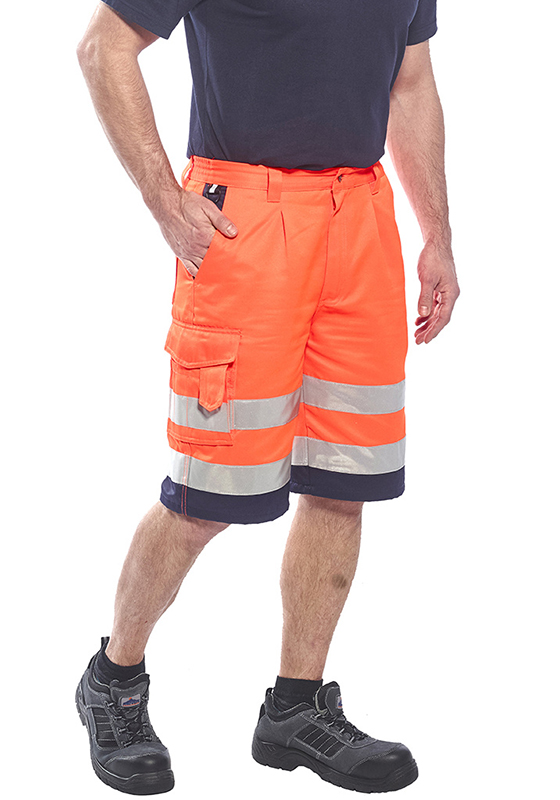 Reflexní krátké kalhoty PORTWEST E043 Hi-Vis - oranžová/navy - stylové letní kraťasy, moderni design, vhodné pro horké letní dny, reflexní pruhy jsou určeny i pro průmyslové praní, lehce přístupné kapsy, tkanina polyester / bavlna s Texpel úpravou odolnou proti špinění, reflexní páska pro lepší viditelnost, 7 kapes pro uložení věcí, dvojitá kapsa na metr, 2 zadní kapsy, D-kroužek v pase pro ID kartu, elastický pas v zadní části pro lepší vzhled, kapsa na mobilní telefon, dvojité švy pro zvýšenou odolnost, povrchová úprava prémiové kvality odpuzuje olej, vodu a nečistoty, certifikováno dle EN ISO 20471 třída 1 po 50 pracích cyklech, tkanina s hodnocením UPF 40+ k blokování 98% UV paprsků, označeno UKCA, tkanina Kingsmill: 65% polyester, 35% bavlna, 245g, velikosti XS,S,M,L,XL,XXL,3XL.