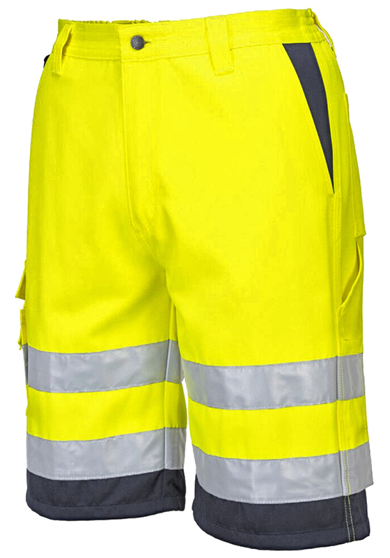 Reflexní krátké kalhoty PORTWEST E043 Hi-Vis - žlutá/navy - stylové letní kraťasy, moderni design, vhodné pro horké letní dny, reflexní pruhy jsou určeny i pro průmyslové praní, lehce přístupné kapsy, tkanina polyester / bavlna s Texpel úpravou odolnou proti špinění, reflexní páska pro lepší viditelnost, 7 kapes pro uložení věcí, dvojitá kapsa na metr, 2 zadní kapsy, D-kroužek v pase pro ID kartu, elastický pas v zadní části pro lepší vzhled, kapsa na mobilní telefon, dvojité švy pro zvýšenou odolnost, povrchová úprava prémiové kvality odpuzuje olej, vodu a nečistoty, certifikováno dle EN ISO 20471 třída 1 po 50 pracích cyklech, tkanina s hodnocením UPF 40+ k blokování 98% UV paprsků, označeno UKCA, tkanina Kingsmill: 65% polyester, 35% bavlna, 245g, velikosti XS,S,M,L,XL,XXL,3XL.
