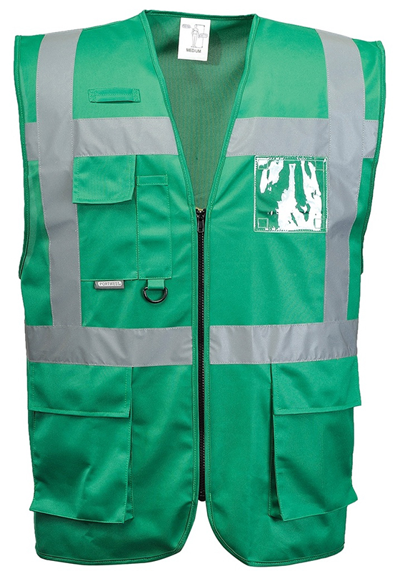 Vesta PORTWEST F476 IONA EXECUTIVE s reflexními pruhy - zelená - luxusní rozlišovací manažerská vesta s reflexními HiVis pásky šířky 5 cm, zapínání na zip, lehká pracovní vesta, která je revoluční svým zpracováním i designem, dvě postranní kapsy s klopami, kapsa na mobil, na tužky a identifikaci, držák dvou ID umožňuje uchycení ID karty na výšku a na šířku, D-koružek na klíče nebo ID kartu, smyčka na radiostanici pro snadné uchycení, materiál 100% polyester Warp Knit 125 g/m2, velikosti S,M,L,XL,XXL,3XL.