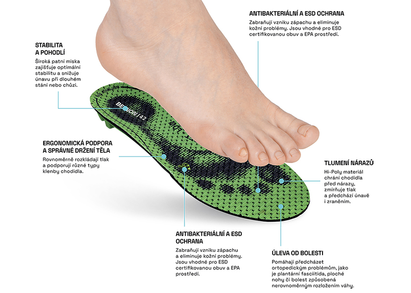 Představujeme Vám vložky BENNON ORTHOCOMFORT ESD Soft Low - anatomicky tvarované stélky vyvinuté speciálně pro morfologii chodidla s nízkou klenbou. Nejde o obyčejnou vložku do bot. Jde o zdravotní a bezpečnostní komponent, který transformuje vaši pracovní i volnočasovou obuv na nástroj pro regeneraci a stabilitu.