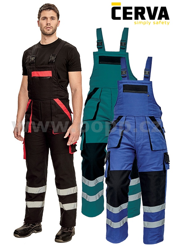 Zateplené montérkové kalhoty s laclem MAX WINTER REFLEX - inovované zimní montérky s náprsenkou z kolekce MAX, kalhoty jsou na nohavicích doplněny o reflexní pruhy šířky 5 cm pro zvýšení viditelnosti, nejedná se o výstražný oděv s vysokou viditelností, 100% BA, 260g/m2, zateplení 100% polyester, zesílená kolena, kalhoty mají dvě zadní kapsy, dvě nabírané přední kapsy a dvě boční měchové kapsy, kapsa na náprsence je na zip, upínání je na nastavitelné plastové spony, barevné kombinace: černo/červené, zeleno/černé, modro/černé, velikosti 46-64.