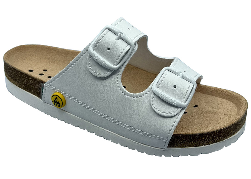 Zdravotní obuv SANTÉ D21E dámské ESD dvoupáskové pantofle - bílé - obuv je vhodná pro nošení v prostředí, kde je požadována antistatická ESD obuv, obuv je opatřena protiskluzovou podešví, která zajišťuje přenos výbojů statické elektřiny do podlahy, stélka obuvi je vyrobena z ,,tvrzeného" korku, který se vyznačuje elasticitou a odolností proti praskání a ESD vlastnosti jsou zajištěny použitím uhlíkové směsi, stélka je ortopedicky tvarována s příčně podélnou podporou klenby a potažena hovězinovou usní, svršek obuvi je vyroben ze syntetické usně, povrch svršku se tedy snadno udržuje a nedochází k olupování a praskání, jako se tomu stává u barvené usně, k optimálnímu nastavení je obuv opatřena 2 stavitelnými nártními pásky, obuv je označena znakem ESD, u každého páru je přibalen protokol s hodnotami odporu neměřenými při výstupní kontrole, barva bílá, velikosti 35,36,37,38,39,40,41.