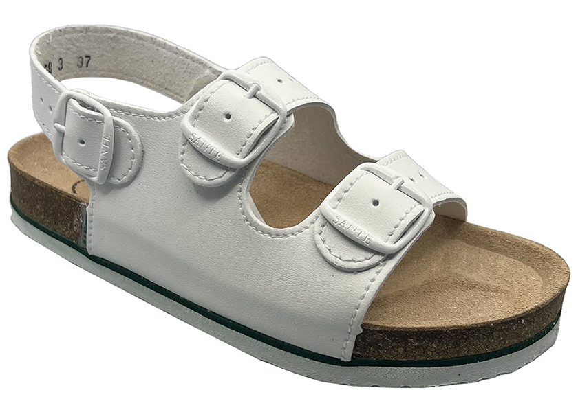 Zdravotní obuv SANTÉ D31H dámské dvoupáskové sandály - bílé - obuv je vhodná jak pro běžné nošení, tak i pro použití ve výrobních a zdravotnických provozech, obuv je opatřena protiskluzovou podešví s certifikací pro profesionální použití, měkká houbovitá mezivrstva změkčující došlap, stélka obuvi je vyrobena z ,,tvrzeného" korku, který se vyznačuje elasticitou a odolností proti praskání, stélka je ortopedicky tvarována s příčně podélnou podporou klenby a potažena hovězinovou usní, svršek obuvi je vyroben ze syntetické usně, povrch svršku se tedy snadno udržuje a nedochází k olupování a praskání, jako se tomu stává u barvené usně, k optimálnímu nastavení je obuv opatřena 2 nártními pásky se zajištěním přezkami a patním páskem na přezku, barva bílá, velikosti 35,36,37,38,39,40,41.